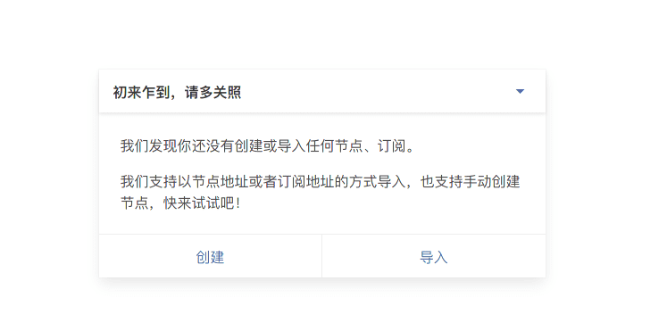 以创建或导入的方式导入节点,导入支持节点链接、订阅链接、扫描二维码和批量导入等方式。