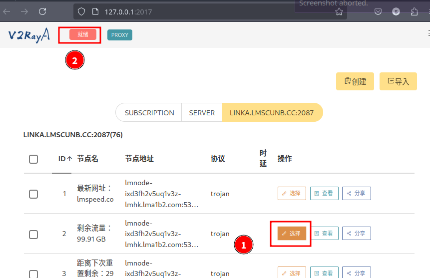 选中导入的节点,然后选在左上角选择就绪,开启代理。