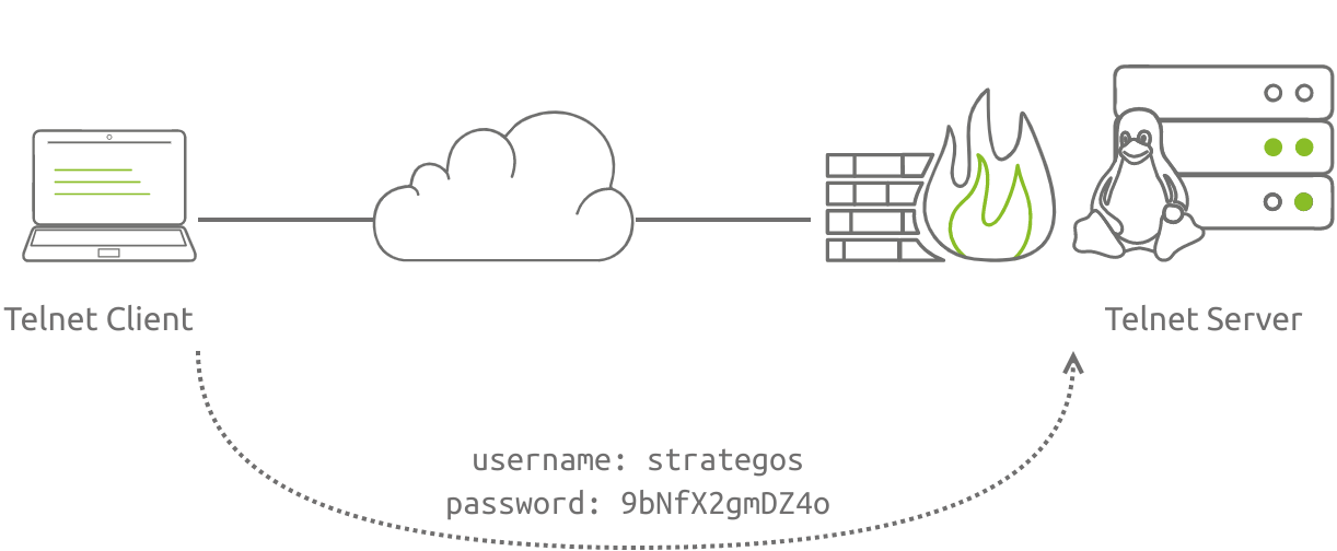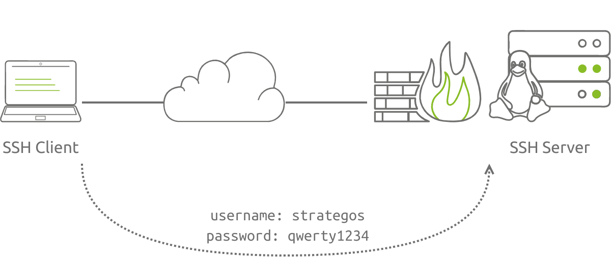 下图显示系统使用 SSH 协议来确保加密通信;但是,身份验证依赖于登录凭据。许多用户都想使用弱密码或将同一密码用于其他服务。虽然 qwerty1234 不在密码词典中,但它通常出现在前 10 或 20 个最常见的密码中,因此很容易被猜到。