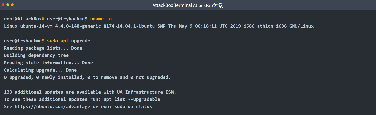 使用Ubuntu LTS版本,您可以在前五年内无需订阅即可下载更新。考虑以下带有Ubuntu 14.04的Linux系统。它于2014年发布,其免费支持于2019年4月结束。换句话说,免费更新服务将持续到2019年。在下面的终端中,我们看到如果我们有Ubuntu Pro(仅限Ubuntu)订阅(以前称为Ubuntu Advantage(UA)for Infrastructure),我们可以下载和安装133个额外的更新。