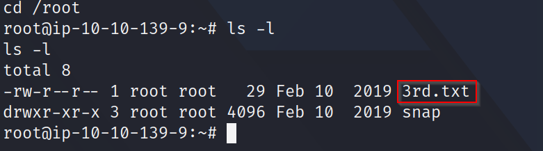 sudo bash -psudo bash到此,我们通过whoami 命令查看,可知我们目前已获取到root权限,让我们跳转到/root下,找到3rd.txt文件,cat 命令查看该文件,获取第三种成分:fleeb juice